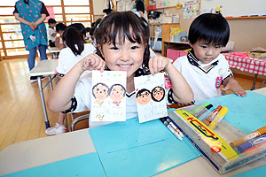 大好きなおじいちゃん、おばあちゃんの顔を思い浮かべながら、似顔絵や「いつまでもげんきでいてね」や、「またそぼうね」などメッセージを書きました。