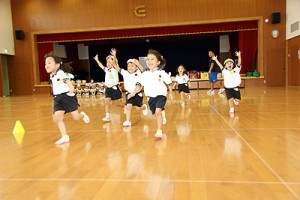 「いちについて!」の掛け声で元気よく「はい!」と返事をすること、そして「ドン!」の合図をよく聞いておくこと、ゴールテープの前で止まらずにバンザイをして走りきることなど、かけっこで、より速く、そしてより格好良く走るためのポイントを体操の先生に詳しく教えてもらいました。