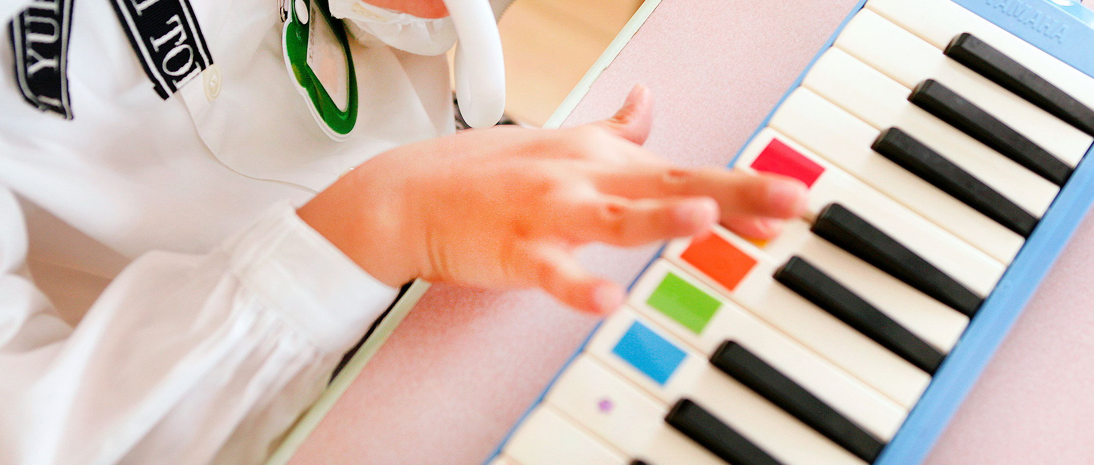 幼児期の音楽的な発達は、情緒的、知的、身体的発達に深くつながっています。この時期にたくさんの美しく楽しい音楽にふれること、音楽体験を重ねることは、子どもたちの感性をより豊かに育みます。園では、日常の歌唱を始め、ピアニカ指導、エレクトーン・シンセサイザー・木琴・鉄琴などの旋律楽器に、大太鼓・ドラム・ボンゴなどの打楽器によるリズム打ちを加えたメロディアスでダイナミックな器楽合奏など、たっぷりと音楽を楽しむ時間を設けています。