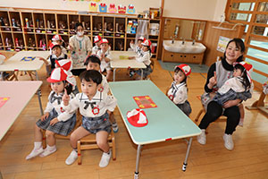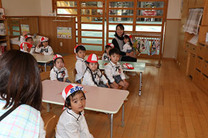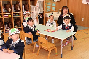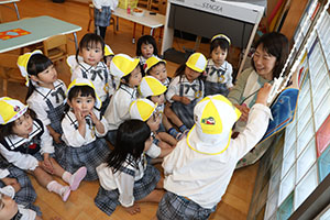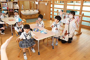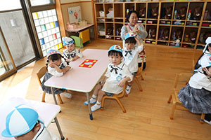 今日はみんなと一緒にお辞儀をして朝のごあいさつをしたあと、先生に絵本を読んでもらったりエプロンシアターをみたり、曲に合わせて手遊びをしたり、たくさん先生たちといっしょに楽しいことをしてにこやかに過ごす微笑ましい姿が見られました。