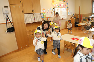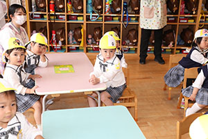各クラスでは、きちんといすに座って先生にエプロンシアターや絵本を読んでもらったり、運動遊びをしたり、園生活を楽しむ様子がみられました。
