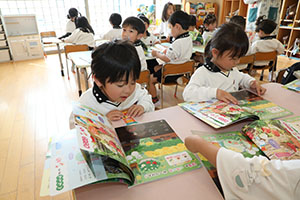 今日は、各クラス朝の会をしたあとに「月刊絵本」に取り組みました☺