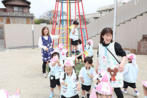 年少うさぎ組さんたちが昨日、自分たちで作ったこいのぼりを持って、園庭にお散歩に出かけました。