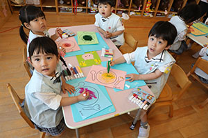 次に先生からのりを使うお約束をしっかり聞いたあと、のりを使って野菜を貼り、美味しそうなスパゲティが出来上がりましたね🍝