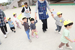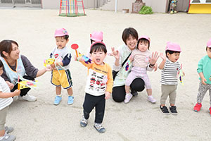 2歳児クラスひよこ・あひる・ぺんぎん組さんたちが、園庭で元気に泳ぐ「こいのぼり」の下でみんなが作ったこいのぼりを持ってニコニコ笑顔で泳がせていました☺