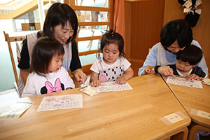 2歳児クラスひよこ組さんたちがカタツムリ🐌の絵が描いてある台紙にシールを貼る練習をしました。