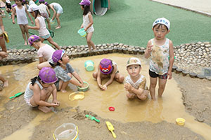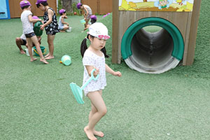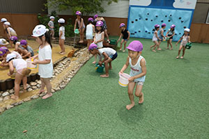 ジャブジャブ池から勢いよく噴き出す水のシャワーを浴びたり、先生と水をかけあいっこしたり、思う存分、涼しい時間を過ごしましたね☺