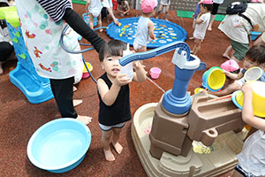 今日はとってもいいお天気になり、2歳児クラスぺんぎん・ひよこ組さんがたちがキッズガーデンで思いっきり水遊びをして遊んでいました。